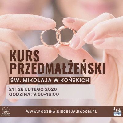 - Ogłaszamy zapisy na Kurs Przedmałżeński (ostatni przed wakacjami!) w naszej Parafii, który odbędzie się 23 i 30 maja. Narzeczeni powinni zapisać się na stronie rodzina.diecezja.radom.pl.
